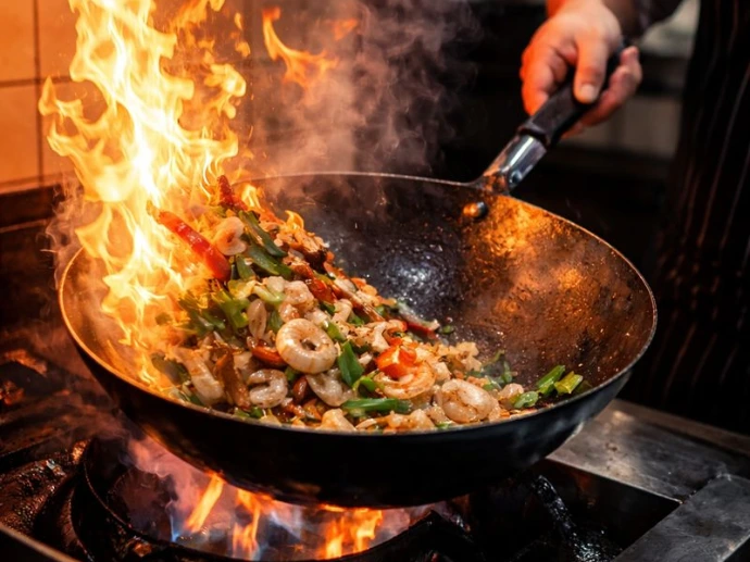 Allt fer á wok-pönnuna, beint fyrir framan þig. Engin bið, engin flækja.
